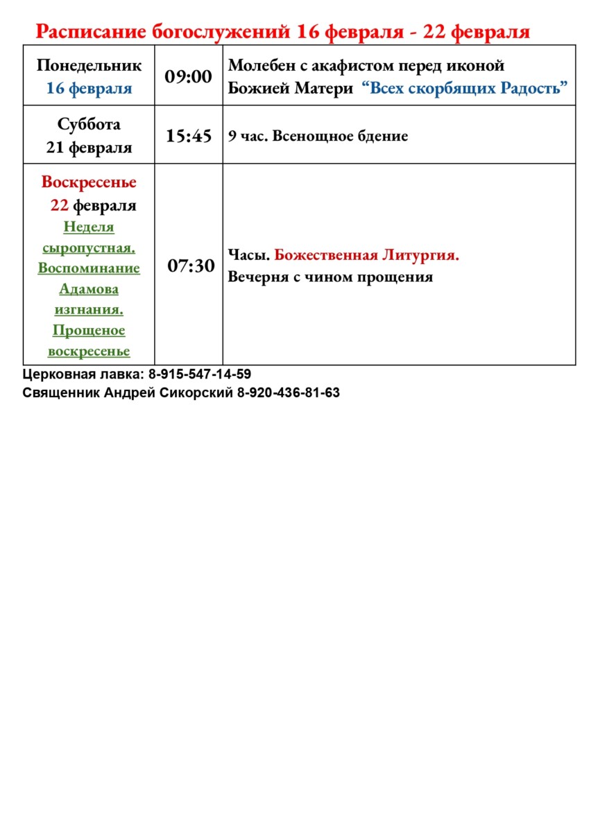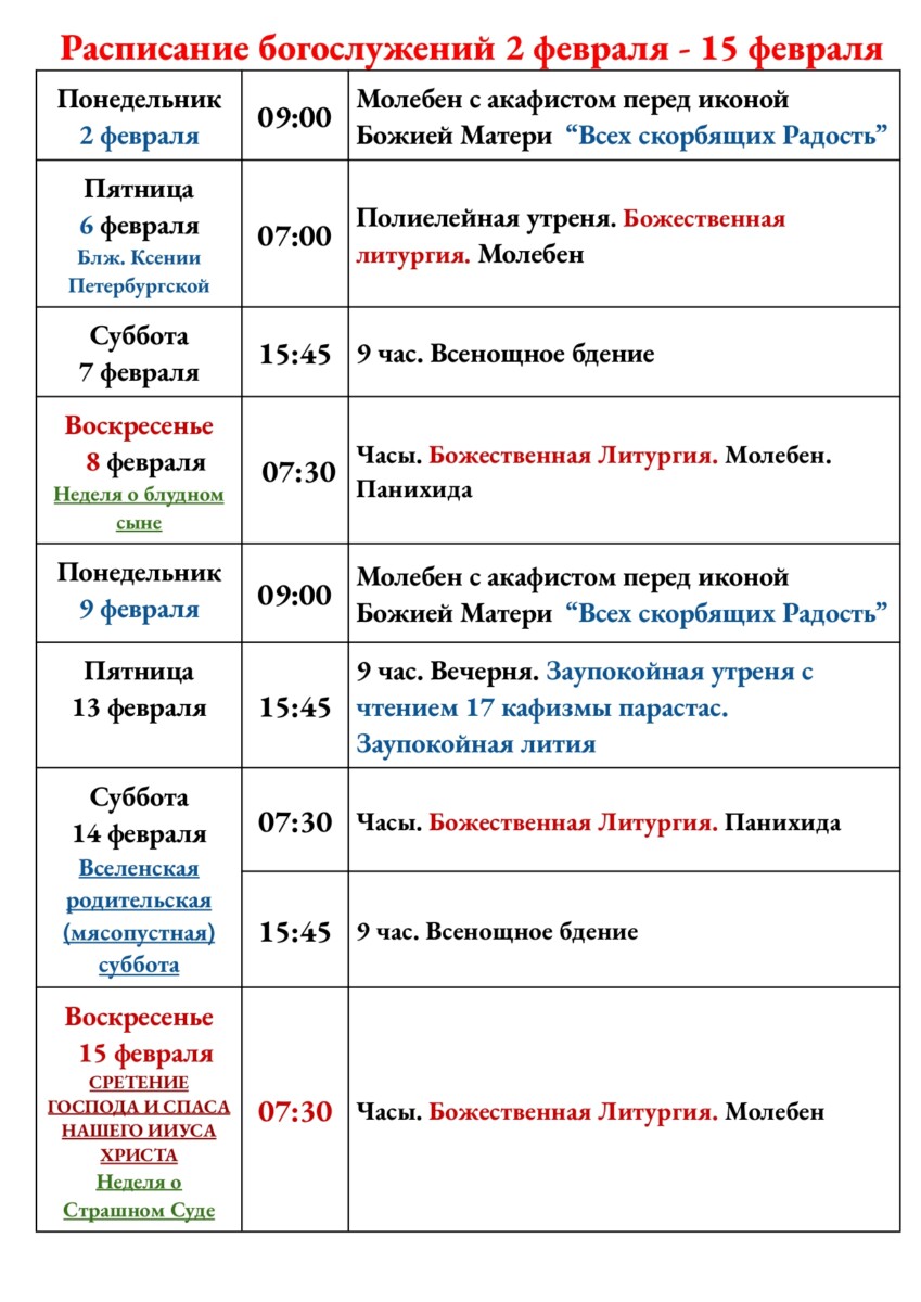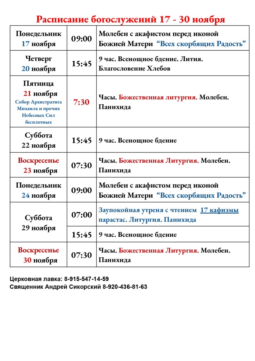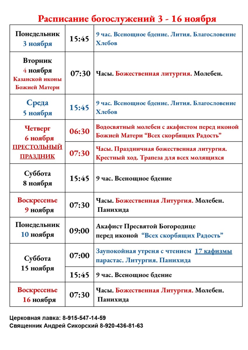 РАСПИСАНИЕ БОГОСЛУЖЕНИЙ
